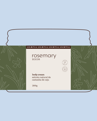 Por isso, decidimos ir numa direção mais natural e calma, muito inspirada na linha "EKOS" da Natura. Fizemos ilustrações de alecrins (rosemary), usamos cores que transmitiam naturalidade e seriedade para a marca e usamos tipografias finas e caligráficas para reforçar seus atributos.